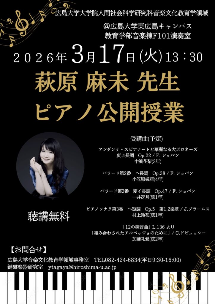 本学の客員教員であり,日本を代表するピアニスト,萩原麻未先生をお招きしてピアノ公開授業を実施します。レッスンは本コース・本領域のピアノを専攻する学生から5名が受講します。どなたでも聴講できますので,どうぞ皆様,お越しください。